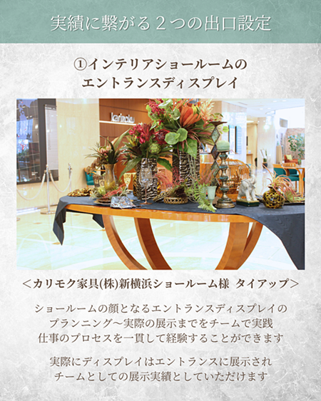 2026年1月スタート、全5回の講座では、大小のスケール感で目的別の納品設定(リアル展示や画像納品)を設け、インテリアショールームでは商業施設での展示~実績を、スタイリングでは商品の見せ方・撮り方・配信の仕方までのスキルを習得していきます。