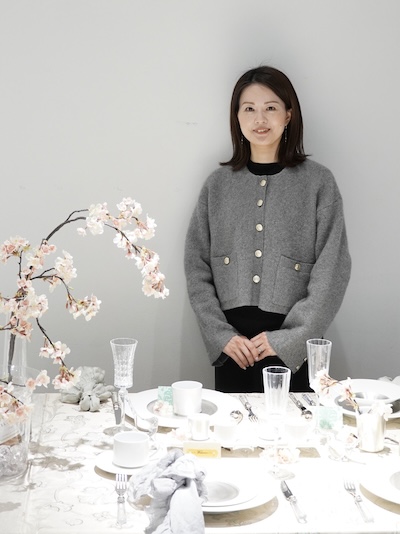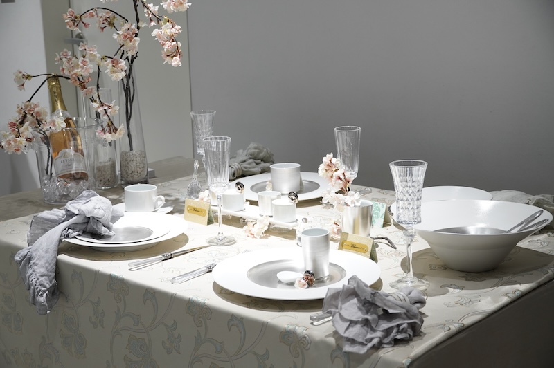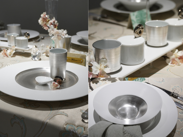 華やかな銀彩の器と満開の桜で春の門出を祝う、そのようなシーンが思い浮かぶように、シンプルながら器の美しさが引き立つコーディネートには、来場者の皆様からも注目が集まりました。