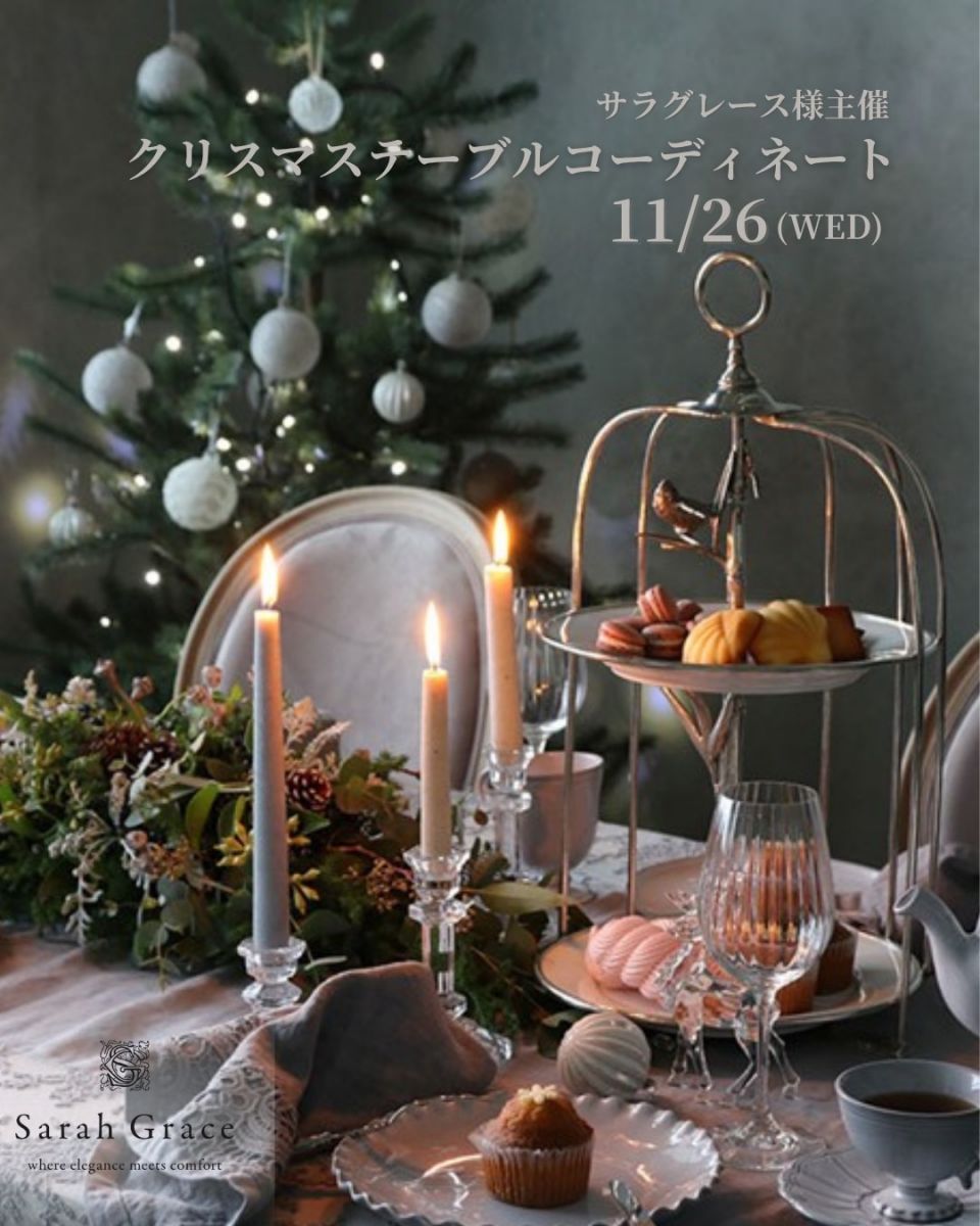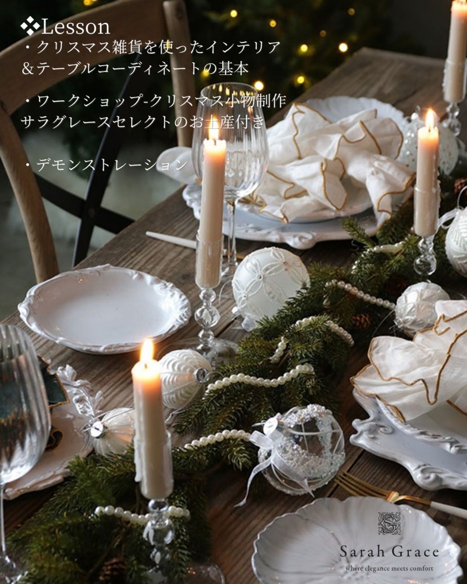 今回のレッスンでは、~プロに学ぶ クリスマステーブルコーディネート~をテーマに、サラグレース様がセレクトしたクリスマス雑貨やテーブルアイテムを使いながら、インテリア&テーブルをトータルで彩る方法を実践的に学んでいただきます。