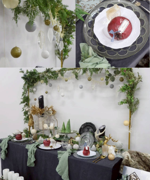 上質で華やかなクリスマスデコレーションが魅力の輸入雑貨ブランド「ハルモニア」様のテーブルウェアやフィギュアを中心に、艶やかで統一感のある世界観を演出しました。